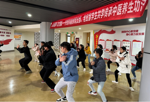 护理学院教师党支部结合医学教育特点,以传承“中医养生功法”为主题,组织教师党员与老挝留学生共学八段锦,在传播中华优秀文化的同时,达到强身健体、愉悦身心的效果,筑牢全民健康观念。