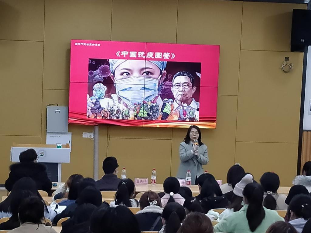 赵洪祥老师向同学们讲述了在武汉期间医务工作者和武汉市民万众一心共抗疫的难忘经历,希望同学们努力提升专业能力,以实际行动履行护士的责任和使命。何锐老师结合自己在自贡当地参与疫情防控的经历,阐述了中国制度在疫情防控中的七大优势,并从职业准备方面向同学们提出了几点建议。