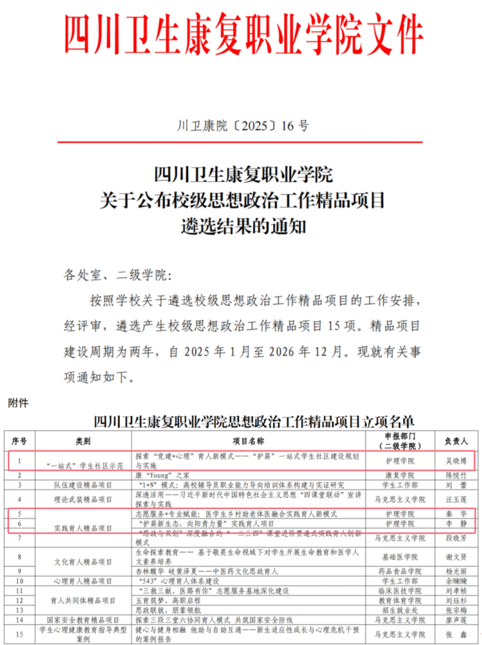 近日,学校公布了2025年校级思想政治工作精品项目的遴选结果,护理学院3个项目成功立项,彰显了学院在思想政治工作方面的创新与实效。