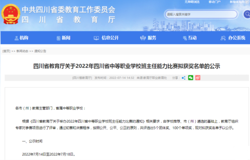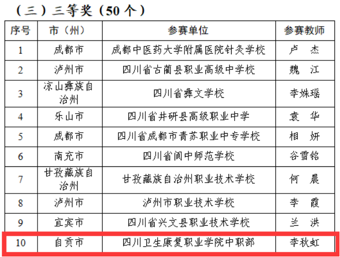 2022年7月14日,由四川省教育厅举办的2022年四川省中等职业学校班主任能力比赛落下帷幕,此次大赛共有各市州、学校推荐参赛选手148人入围,经过“班级建设方案”“主题班会实录视频”“典型工作案例”等环节的激烈角逐,护理学院辅导员李秋虹最终荣获三等奖。