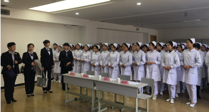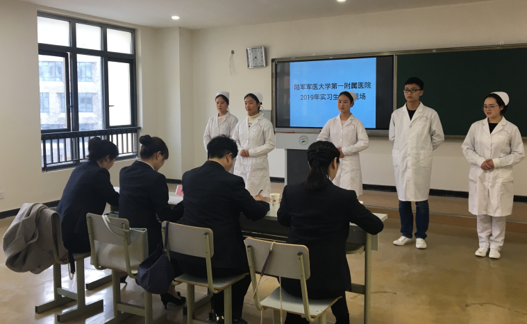 陆军军医大学第一附属医院护理处总护士长胡绍毅、整形美容科护士长刘莎、护理处助理周巧宁以及泌尿外科教学组长卞先莲四位专家亲临bat365,对2017级自愿报名到陆军军医大学第一附属医院实习的114名学生进行选拔,选拔工作在3号楼B310进行。面试过程中,同学们个个精神饱满,对专家提出的问题有条不紊的进行了回答,面试现场气氛轻松和谐,最终25名学生成功入选。