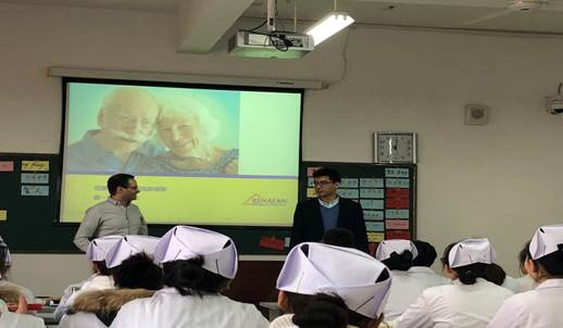 bat365与德国蕾娜范集团共同开发的德国养老护理课程今日已进入开班第4天,本次课程由来自德国的麦克·古驰先生主讲,王青老师翻译。初见两位帅气的老师,同学们心中颇为窃喜,古驰老师高挺的鼻梁,英俊的侧颜集聚了欧美人的优雅气质。王青老师骨骼健壮,镜片后面透露着学者的睿智光芒。尽管听不懂麦克老师说话,但是从他的肢体语言和动作表情中我们就能感受到他的幽默。王青老师的翻译更是令此次养老护理的课程如虎添翼。两位老师配合默契、风趣幽默的教学让我们对课程充满了兴趣和期待。