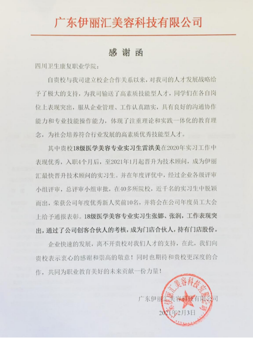 广东伊丽汇美容科技有限公司致函感谢bat365为企业输送高素质技能型人才,并对bat365学生实习表现给予了充分的肯定,也期望与bat365继续加强合作,培育优质医美人才。