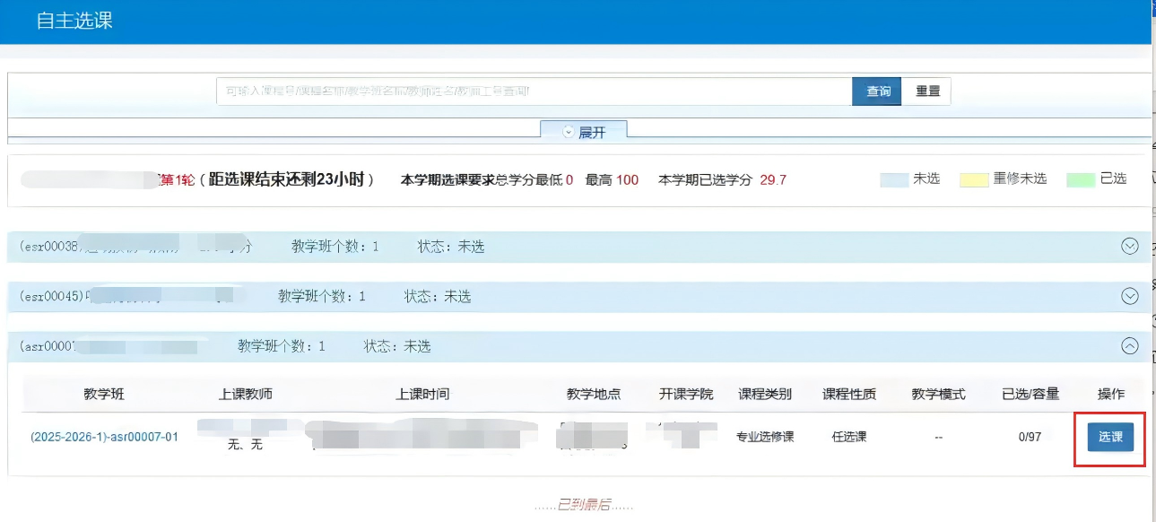 (4)先选择模块:“主修课程”,再点击箭头符号展开教学班信息,最后点击【选课】按钮,当选课按钮变为【退选】后,就证明选课成功了