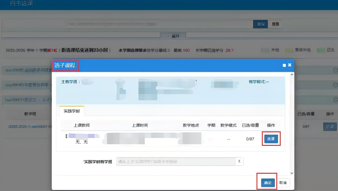 (5)因本学期部分选修课课程分理论学时和实训学时单独排课,此类课程在点击【选课】按钮后,会弹出此课程的子课程,再次点击子课程的【选课】按钮,当选课按钮变为【退选】后,就证明选课成功了。
