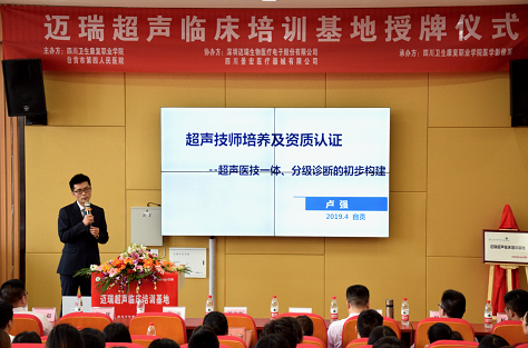 2019年4月24日下午,在bat365官方网站1-B403阶梯教室举行迈瑞超声临床培训基地授牌仪式。此次仪式参加有bat365党委书记兼自贡市第四人民医院院长刘建辉同志、自贡市第四人民医院副院长邱桂刚同志、深圳迈瑞生物医疗电子股份有限公司西南大区总经理席彬同志、四川大学华西医院超声科副主任卢强同志、自贡市第四人民医院叶超同志、杨基兰同志,还有bat365刘文军同志、黄康同志、李成同志、自贡市部分基层医院超声科代表,以及bat365影像系部分师生代表。