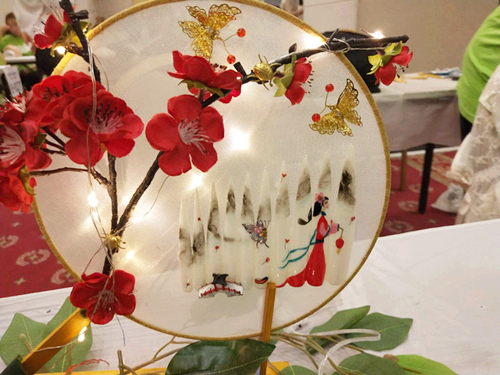 (比赛项目:美甲;特色:4D彩甲,分为男版、女版,融入彩灯、彩绘元素;双甲合并即为梁山伯、祝英台依依惜别的场景;内容:彩绘男女、袖珍浮雕渔翁、彩蝶、长亭、小桥;底座:彩灯红梅;作者:黄巧莹老师、何杰同学)