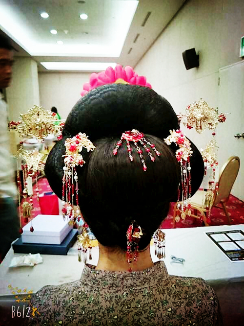 (比赛项目:创意发型;特色:高鬓发;华丽、正式;内容:以中国南北朝、唐朝、明末清初时期宫廷女性发型为参考而创作的牡丹头发型,寓意浓情、圆满;作者:刘英燕同学)