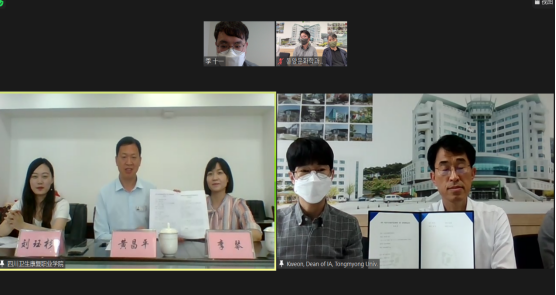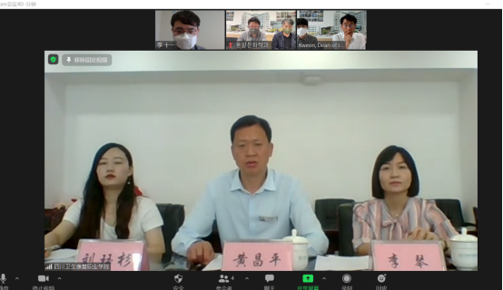 5月26日,bat365与韩国东明大学线上签约仪式在1教A402顺利举行。学校校长黄昌平、行政办公室主任李琴、护理学院学生科科长刘珏衫、东明大学副院长权重洛、艺术设计系教授兼教育院主管王东等出席了签约仪式。