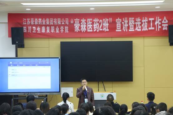 10月24日晚,学院与江苏豪森药业集团有限公司共同举办的“豪森医药2班”学员选拔工作会在1-B405召开。江苏豪森药业集团有限公司四川川东区域经理徐文斌、自贡办经理张桥、人力资源部范旭东以及药学系师生共计200余人参加会议。