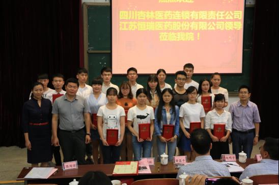 6月27日下午,学院首届“恒瑞医药班”、“杏林医药2班”经验交流与表彰大会在113阶梯教室隆重举行。学院院长曾晓奇,副院长黄昌平、罗天蔚,江苏恒瑞医药股份有限公司以及四川杏林医药连锁有限责任公司嘉宾、部分职能处室负责人及药学系师生共计300余人参加了此次大会。
