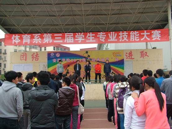 2012年11月10日下午2:30分,体育系第三届学生专业技能大赛在江南校区田径场拉开帷幕。体育系党总支书记沈军、辅导员郭建鹏、技能教研室主任郭西魁、理论教研室主任陈治强参加了开幕式。