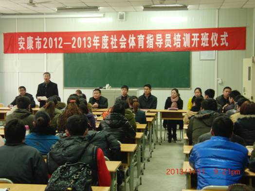 2013年1月12日上午9:00,安康市2012-2013年度社会体育指导员培训班开班典礼在我校举行。安康市体育局党组成员、纪检组长陈复勇、安康团市委副书记梁鸿、安康市体育局群体科科长朱小燕、安康学院体育系主任冯德学、安康学院体育系副主任鲁宗成等领导以及部分授课教师和全体学员共一百余人参加了开班典礼,典礼仪式由安康学院体育系党总支书记沈军主持。