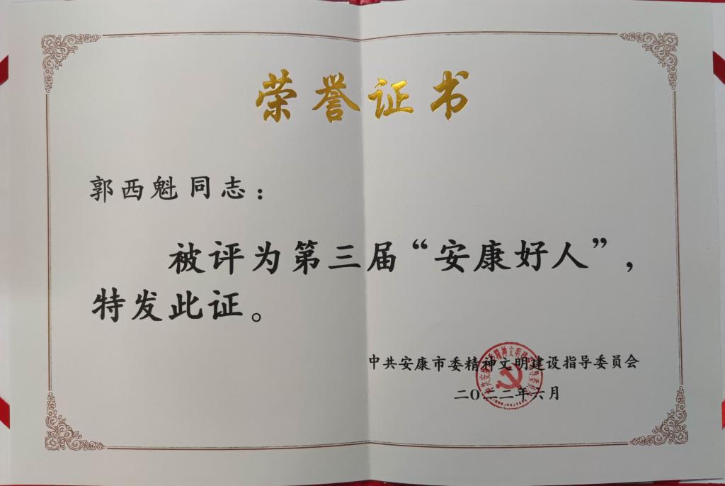 5月31日,中共安康市委精神文明建设指导委员会,授予全市62名(组)同志第五届安康市道德模范称号,授予77名同志第三届“安康好人”称号。我院副院长郭西魁同志被授予第三届“安康好人”称号。希望大家向安康市道德模范称号和“安康好人”称号获得者学习,积极参与安康市的精神文明建设,以优异业绩,向党的二十大献礼。