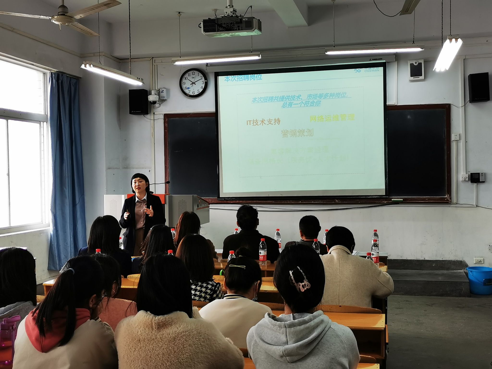 招聘会分两个环节进行,一是宣讲环节,领军教育的懂得体育大市场负责人贾妮、安康移动人力资源部经理姜琼。分别就单位环境、招聘岗位、工作内容、晋升路径、薪资待遇等方面做了具体讲解,并鼓励同学们大胆尝试,勇于创造出一番自己的事业。在企业与毕业生互动交流环节中,企业就毕业生们所关心的方面给予了详细解答,同时就毕业生在就业方向选择上的疑惑,结合企业和毕业生实际情况一一作答,并提出建设性的意见和建议;二是参会学生就应聘岗位的具体细节与用人单位进行充分沟通,据统计,会后共有三十余名同学投递简历、参与面试。