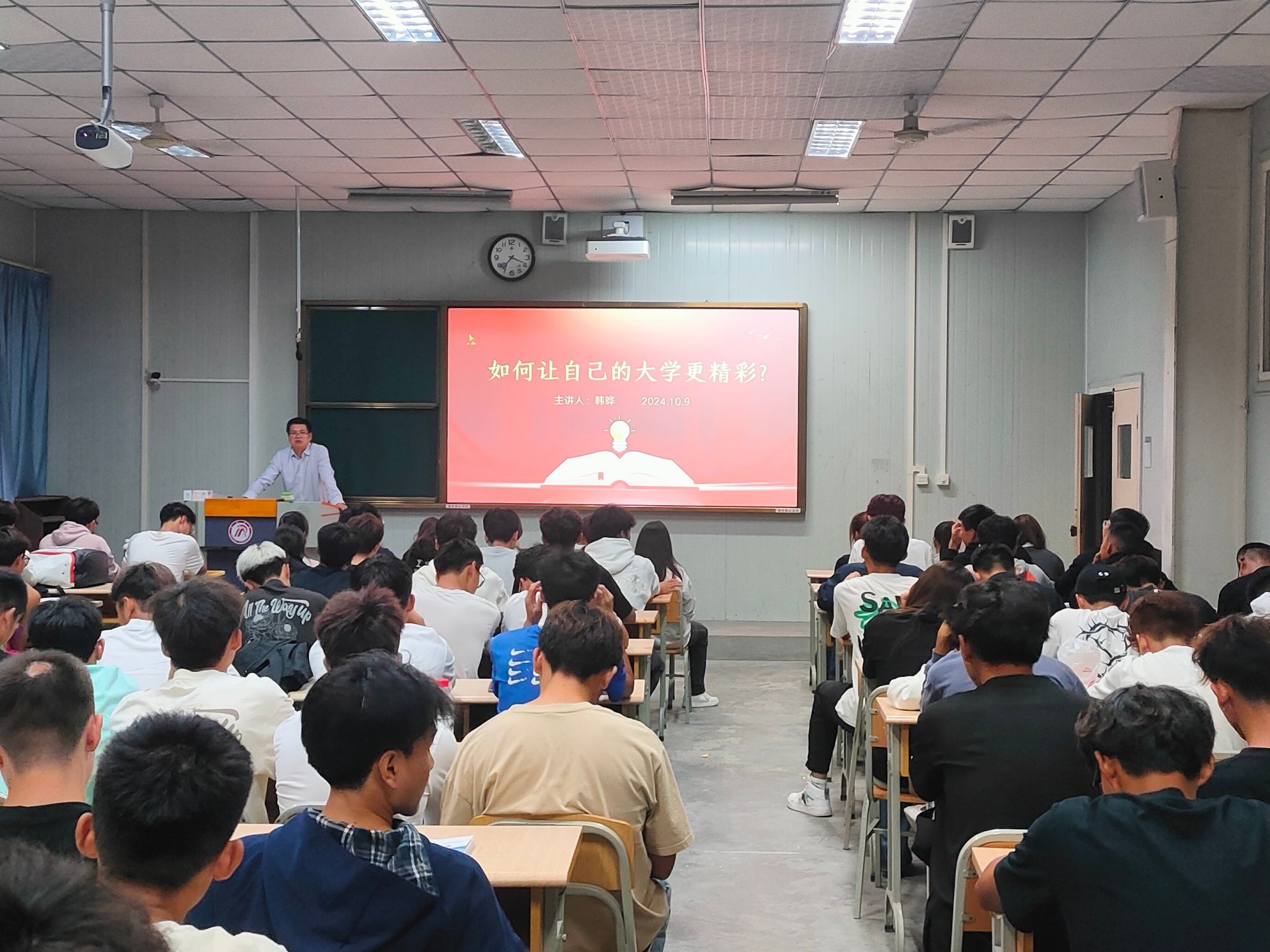 2024年10月9日晚上,澳门网投官方网站党总支书记韩晔在10号教学楼1038教室为2024级体院新生带来入学教育课——如何让自己的大学更精彩。韩书记从“认识大学、学会学习、遵守纪律、做好发展”四个方面勾勒出精彩大学四年应有画像雏形,为24级全体新生带来大学启蒙教育,帮助他们正确认识大学,认识自我,了解未来发展趋势,坚定专业自信。