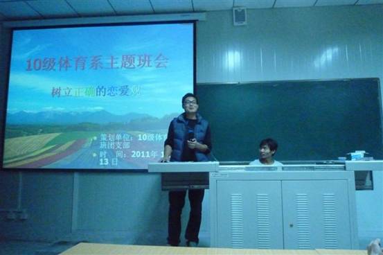 1120晚,体育系10号教学楼成功举行了“树立正确的恋爱观”的主题班会,辅导员梁鸿老师和体育教育10级全体学生参加了班会