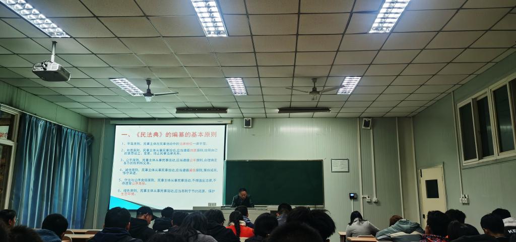 近日,澳门网投官方网站党总支书记高立平在1026教室为全院学生党员、团总支、学生会干部以及主要班团干部开展《民法典》讲座。澳门网投官方网站学工办副主任王立、团总支书记康梦瑶也聆听了讲座。