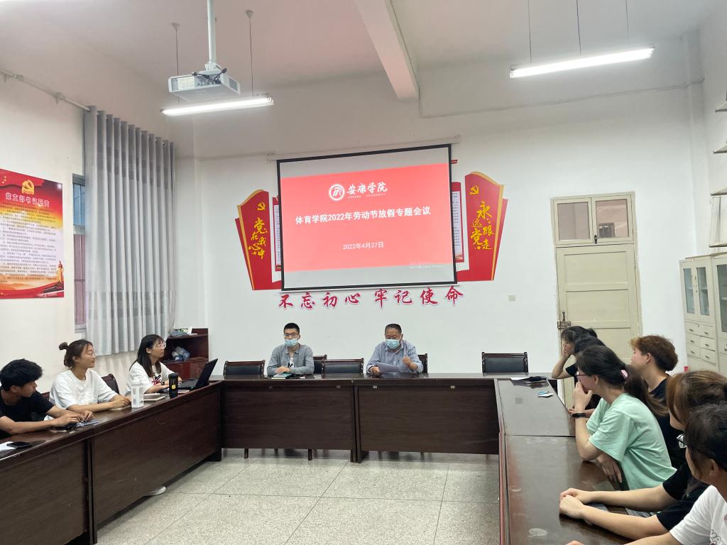 4月27日下午6点在体育馆1楼会议室召开澳门网投官方网站2022年劳动节放假专题会。澳门网投官方网站党总支书记高立平、学工办副主任王立、团总支书记康梦瑶、宿舍信息员参加了会议。会议由学工办副主任王立主持。
