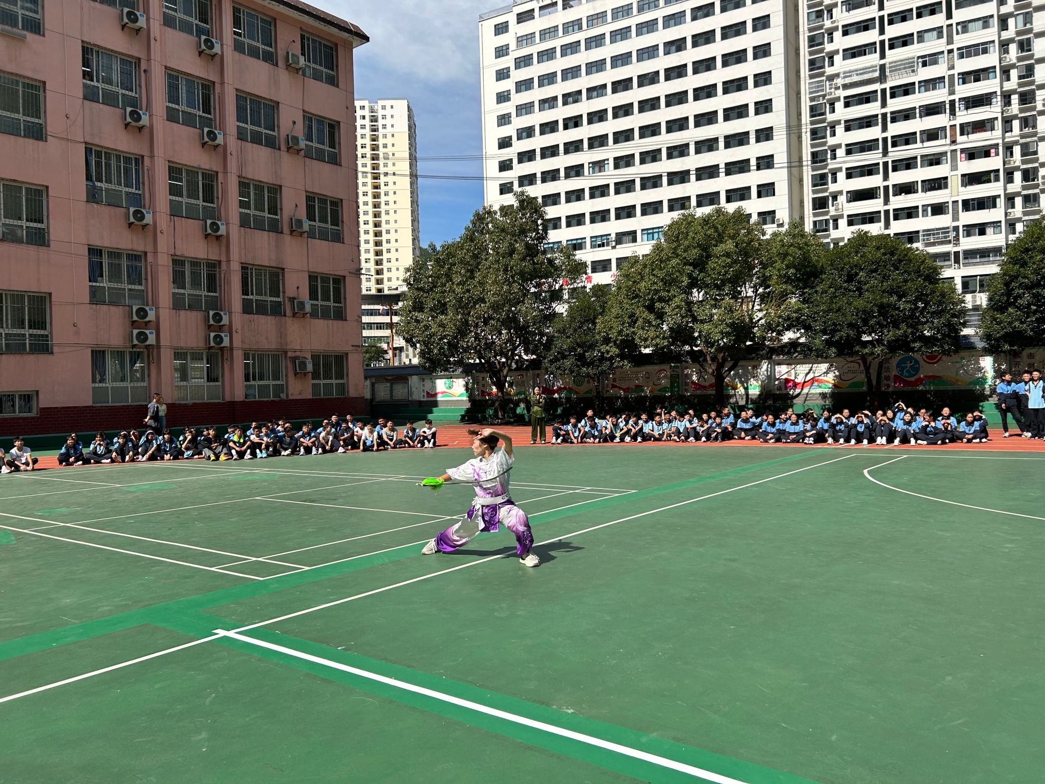 9月1日上午,高立平为镇平县初级中学师生做了安全教育方面的演讲,随后我院武术队同学将传统文化与校园健身相结合,进行了精彩的展演,并现场进行了八段锦的推广教学,赢得阵阵掌声。下午我院利用本次机会,前往钟宝镇金领村二组对困难学生进行了走访慰问。
