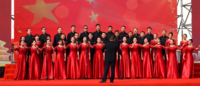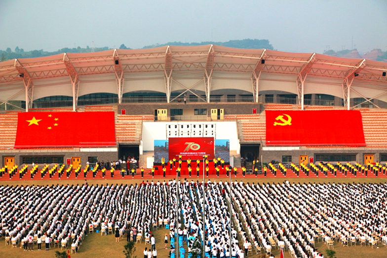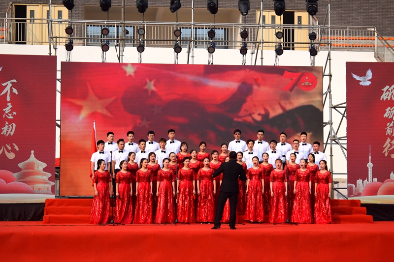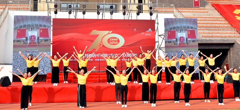 《保卫黄河》《在灿烂阳光下》等合唱,唱出了学院全体教职员工对祖国母亲的热爱之情。红旗舞、手语舞,展现了学院师生为祖国而骄傲自豪之情。《爱国奋进·砥砺前行》朗诵,读出了川康人“不忘初心、牢记使命的”铮铮誓言。最后,7000余名师生在会场上挥舞着红旗,齐声高唱“五星红旗迎风飘扬,胜利歌声多么嘹亮,歌唱我们亲爱的祖国,从今走向繁荣富强......”