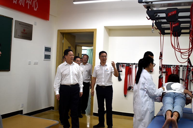 杨兴平一行首先乘坐观光车参观了bat365校园,观看了康复系实验实训建设、学生康复辅具展,听取了学院办学历史、新校区建设及教育教学工作情况详细汇报。当了解到学院今年录取的新生较去年增加近1000人,在校生人数达到9000人,招生人数和在校生人数均创历史新高时,杨兴平高度肯定学院一百年来为四川医学教育及在卫生健康事业中所做的贡献,鼓励学院加快新校区综合体项目建设,完善功能用房和配套设施,加快推进学院高质量发展,培养更多优秀医学人才,发挥医疗、教育综合优势,为健康四川、健康自贡建设作出更大贡献。
