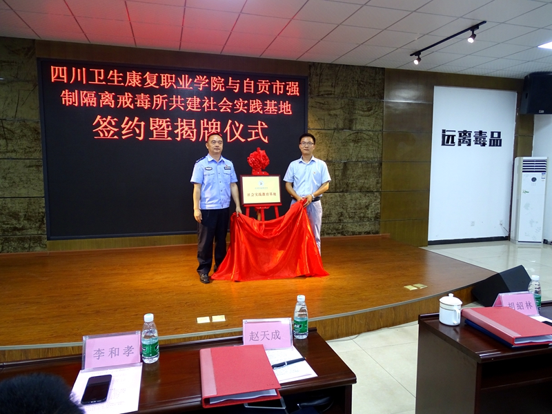 到达禁毒基地后,在工作人员的解说和带领下,师生先后观看了毒品仿真模型、禁毒展示窗口、宣传展板例、禁毒警示教育片,体验了VR模型,并现场聆听了戒毒人员现身说法。戒毒人员以一封写给父亲的家书为主线,痛诉了自己因交友不慎,犯下一时错误,给家庭和亲人带来了巨大痛苦,酿下了终身的悔恨与苦果,并劝告大家一定要热爱生活、珍爱生命、拒绝毒品。最后,赵天成受学院委托,代表学院与自贡市强制隔离戒毒所签订了为期两年的共建社会实践基地协议,并与胡绍林一起为基地揭牌。