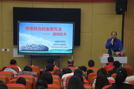 讲座中,侯乐荣教授以医体融合的概念为核心,详细阐述了如何将体育増强体质的功能与医学预防、治疗和康复功能融为一体,体育将如何在増强体质、预防和延缓疾病、功能恢复、运动伤病预防等方面发挥有效作用,以及运动处方的概念、分类和原则,并针对不同人群提出个性化“运动建议书”。侯教授运用生动的语言、标准的示范和详实的数据资料做了精彩的学术报告,加深了大家对“运动处方”的理解,强化了健身意识,拓宽了学术科研视野。