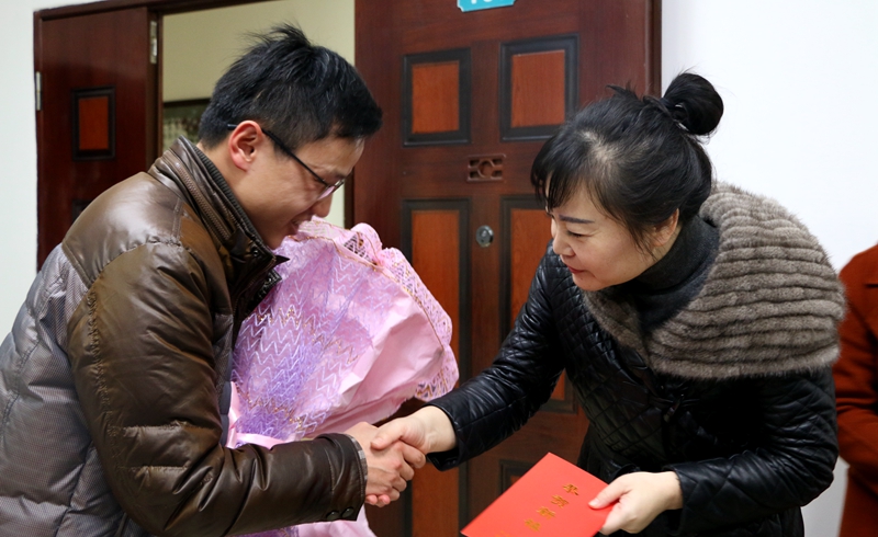 “新春将至,祝你万事如意,也代问你的家人好!”袁熙向任凯送上鲜花和贺卡,并将党和政府的关怀及新春祝福送到任老师心中。