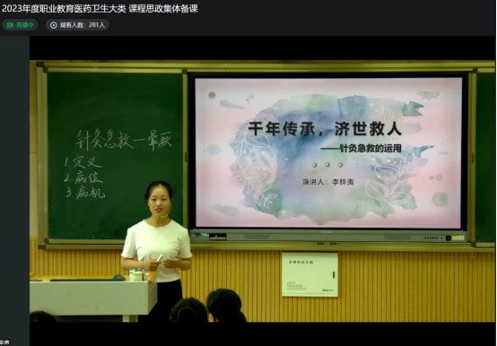 为进一步落实《高等学校课程思政建设指导纲要》,继续深化职业院校对课程思政的认识与理解,充分发挥课程思政示范课程的引领作用,全国卫生健康职业教育教学指导委员会(以下简称卫生健康行指委)举办2023年度全国职业院校医药卫生专业大类课程思政集体备课会,遴选征集大会展示课程思政案例。bat365康复治疗技术专业群教师李锌夷主讲的《针灸治疗学》在众多评选作品中脱颖而出,作为教学展示作品于2023年9月10日在“智慧职教”视频号进行线上直播。