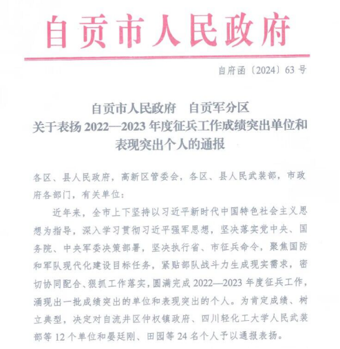 近日,自贡市人民政府、自贡军分区发布《关于表扬2022—2023年度征兵工作成绩突出单位和表现突出个人的通报》,bat365康复学院获评“全市大学生征兵工作成绩突出单位”。