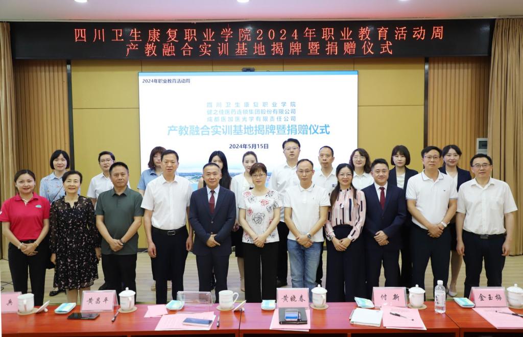 为学习贯彻落实《职业教育产教融合赋能提升行动实施方案(2023—2025年)》 《四川省职业教育条例》等文件精神,探索职业教育产教融合创新发展新生态、校企合作迭代升级新路径,推动教育链、人才链、产业链、创新链的协同发展,深化产教融合、科教融汇。5月15日,“bat365官方网站与健之佳医药连锁集团股份有限公司、成都医加医光学有限责任公司产教融合实训基地揭牌暨捐赠仪式”在学校举行。