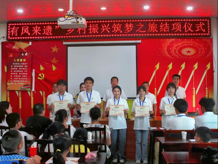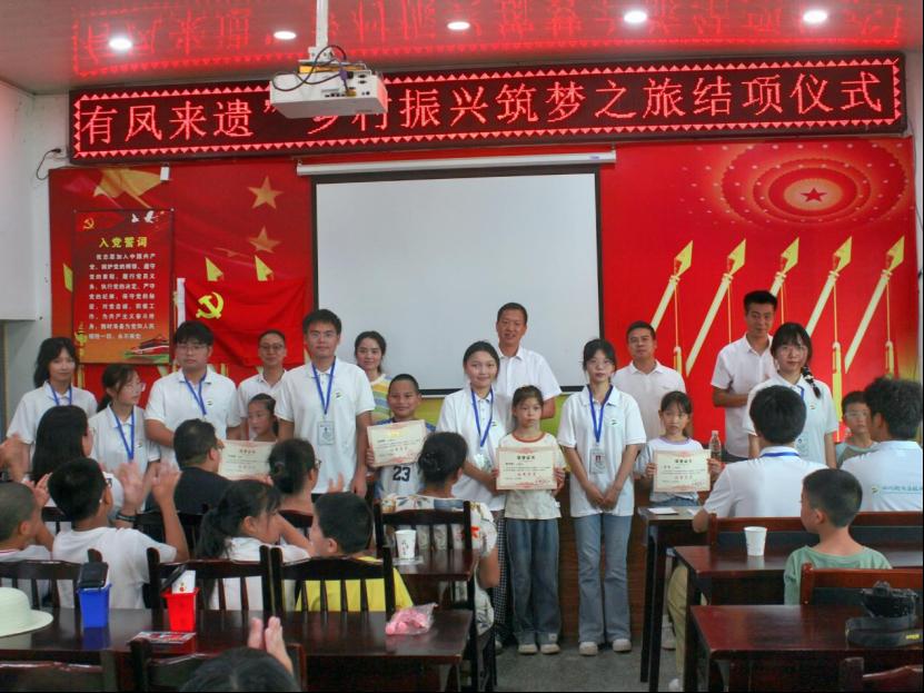 结项仪式上,领导一行向参加服务的优秀儿童和优秀实践服务队员颁发了“先进个人”证书并给予表彰。黄校长发表讲话,一是感谢古佛镇、凤仪村连续三年为学校实践服务团队提供的各种保障和支持工作;二是祝愿古佛镇和凤仪村在深化城乡融合发展改革中乘势而上越来越好,祝愿参加托管班的小朋友们快乐成长,明天更好;三是希望实践服务团队坚定理想信念,逐步突破自我、成就自我,将青春和力量在祖国大地上奉献绽放。