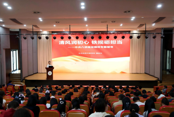 4月30日下午,学校邀请市委党校潘金台教授来校作“清风润初心 铁规砺担当”深入贯彻中央八项规定精神学习教育专题辅导。学校班子成员、全校教职工参加。宣讲会由学校纪委书记李雁梅主持。