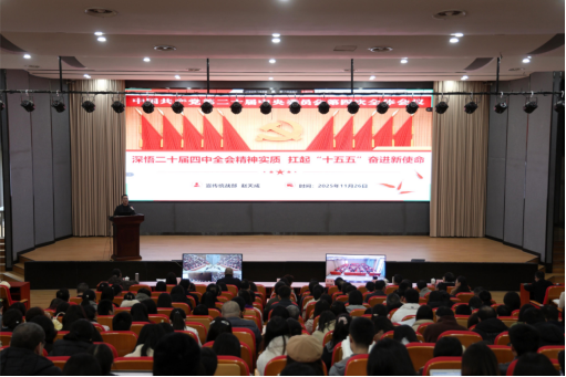 为深入学习贯彻党的二十届四中全会精神,11月26日,学校开展了党的二十届四中全会精神专题集中学习。学校领导班子成员、全体教职工参加学习,学校宣传统战部部长赵天成主讲。