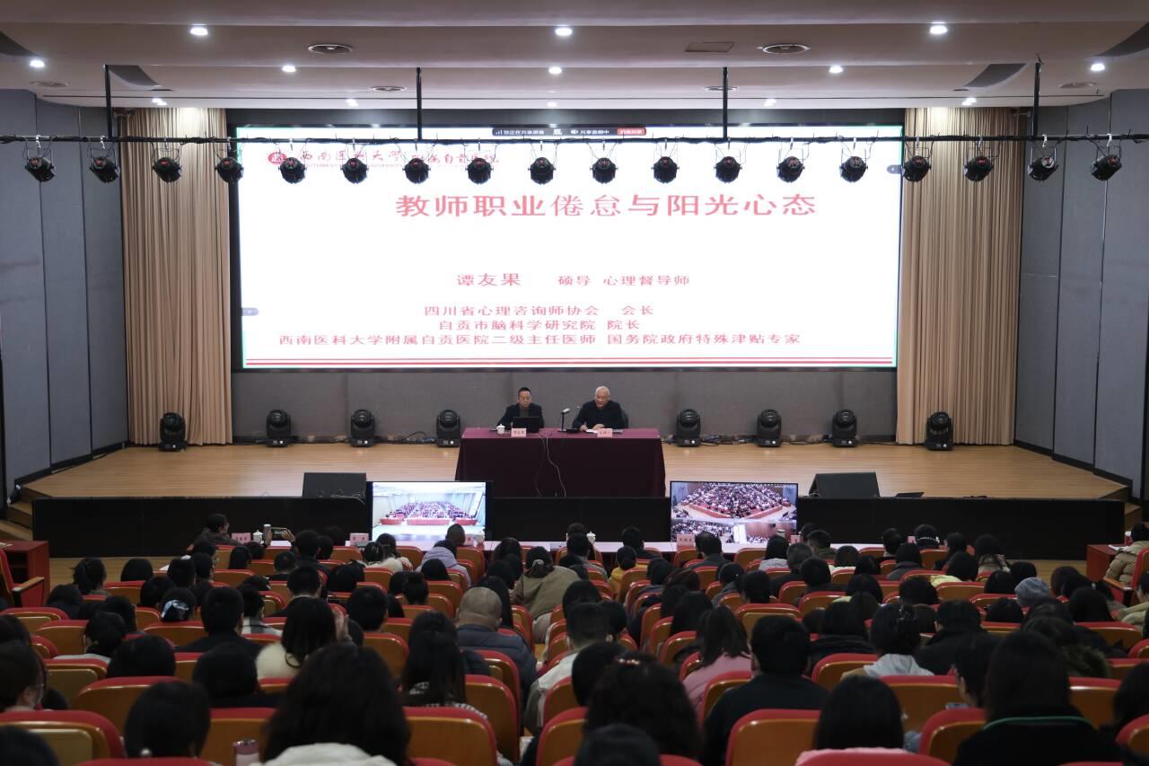 为进一步加强教职工心理健康建设,筑牢教育教学工作精神根基,12月3日,学校特邀国务院政府特殊津贴专家、全国十大优秀精神科医师、四川省心理咨询师协会会长谭友果以“教师职业倦怠与阳光心态”为主题为全校教职工开展心理健康教育宣讲。