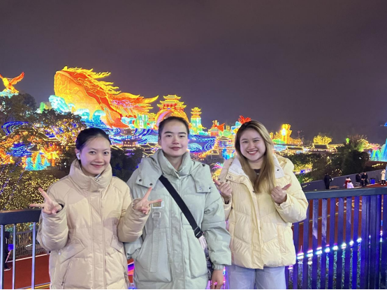23日晚,留学生们受邀参加“灯绘华夏•筑梦未来”第32届自贡国际恐龙灯会开幕式,亲身体验这场融合非遗技艺与前沿数字科技的沉浸式盛会。他们不时驻足观赏、合影留念,纷纷赞叹这场视觉与文化的双重盛宴。来自2023级护理国际班的老挝留学生李诗音感慨道:“每年的自贡灯会总能带给我新的惊喜!身为一名即将毕业的老游客,尽管这是我最后一次以学生的身份看灯会,但我依旧被眼前绚丽多彩的彩灯所震撼,我更加渴望深入了解中华优秀传统文化的魅力。未来,我一定会努力成为中老交流的小小桥梁。”