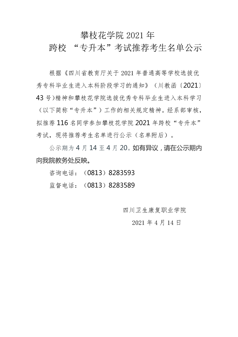 上一条:成都文理学院2021年 跨校 “专升本”考试推荐考生名单公示