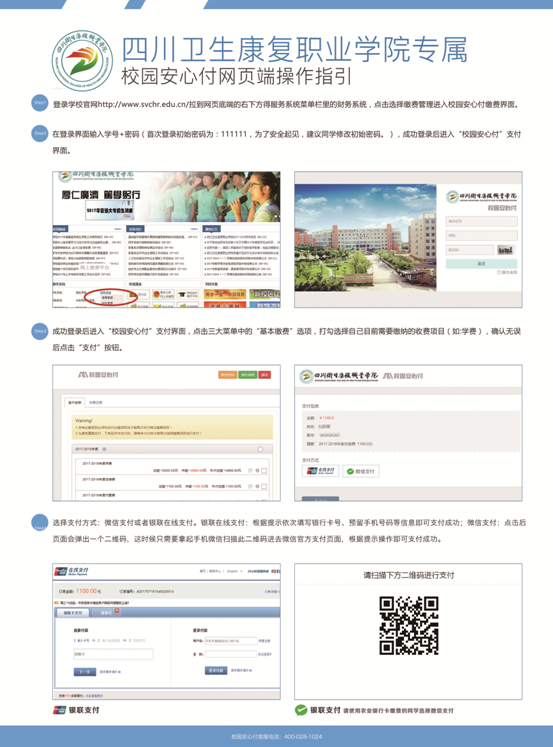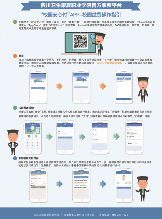 三、本次缴费方式为网上缴费。同学们可通过手机端、网页端及微信端在校园安心付支付平台上进行缴费(具体流程操作见附件)。