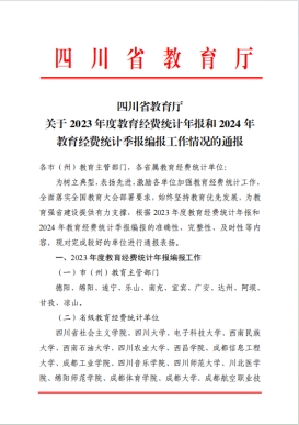 近日,四川省教育厅发布《关于2023年度教育经费统计年报和2024年教育经费统计季报编报工作情况的通报》,bat365因编报准确、完整、及时,获省教育厅通报表扬。