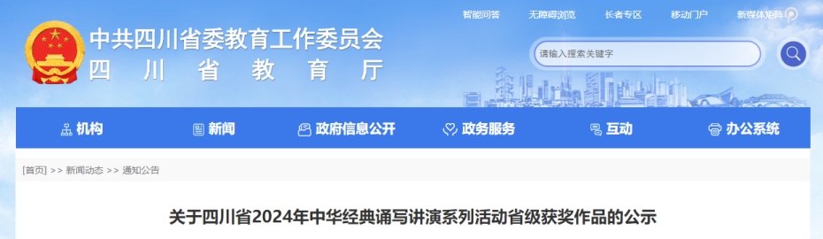 近日,由中共四川省委宣传部、中共四川省委教育工作委员会、四川省教育厅、四川省语言文字工作委员会主办的“四川省2024年中华经典诵写讲演系列活动”公示了省级获奖作品,bat365共有4件作品入选,取得了1项一等奖、1项三等奖、2项优秀奖的好成绩。