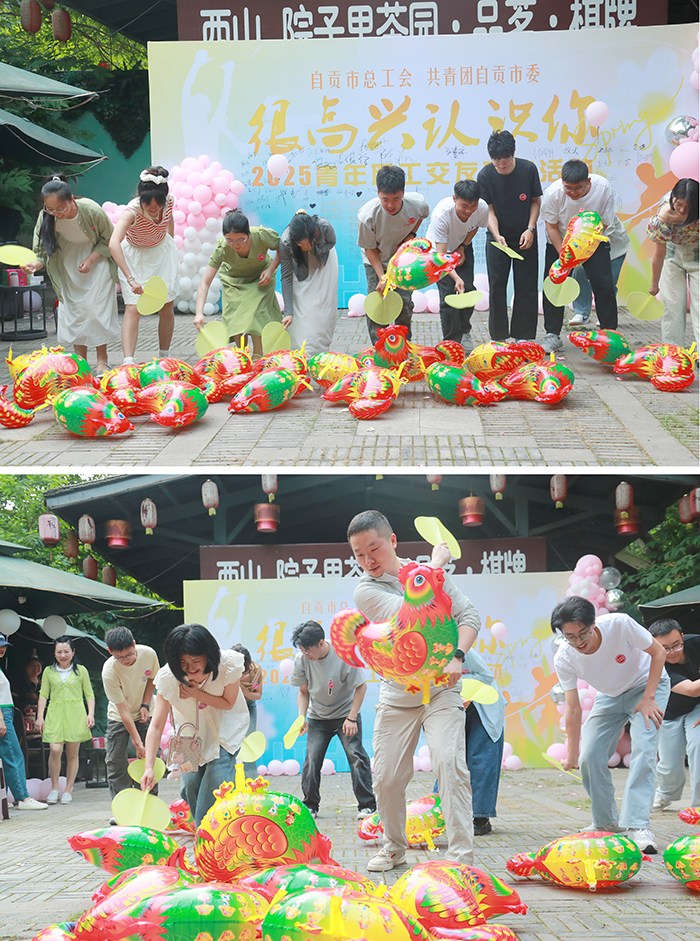 趣味互动打破隔阂,欢声笑语点燃现场。“踩气球大作战”“赶鸡进笼” 等破冰游戏成为拉近青年距离的催化剂。在踩气球环节中,各组青年两两对抗,一边护着自己脚上的气球,一边灵巧地 “进攻” 对手,现场欢呼声、尖叫声此起彼伏;赶鸡进笼游戏里,队员们手持扇子 “驱赶” 道具鸡,滑稽的动作和紧张的协作引得全场捧腹。游戏不仅考验了团队默契,更让青年们在互动中卸下防备,迅速熟络。获胜队伍捧着纪念品时,脸上洋溢着协作共赢的喜悦。