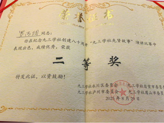 此外,罗西倜还参加了由永川、眉山、泸州、自贡九三学社联合组织的纪念九三学社创建八十周年“川渝汇同心 携手庆华诞”文艺演出活动,在“九三学社先贤故事”演讲比赛中,罗西倜再次以精彩的发挥获得二等奖,展现了医院职工深厚的人文素养与良好精神风貌,也为医院赢得了荣誉。