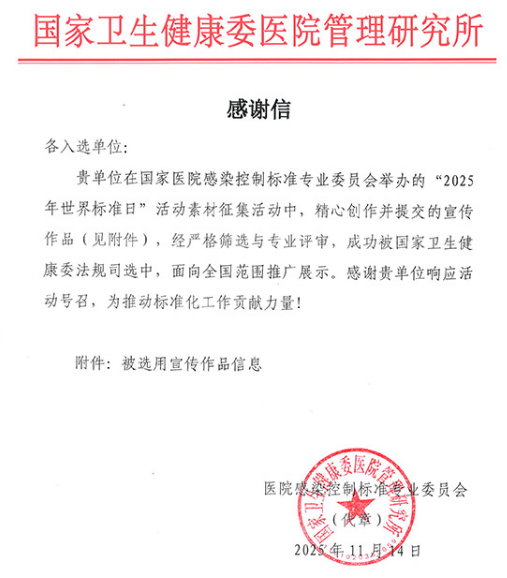 国家卫生健康委医院管理研究所专程来信致谢,肯定医院在医院感染管理领域的专业积淀与创新实力,感谢医院为推动标准化工作所作出的贡献。
