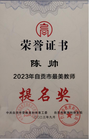 9月7日晚,在第39个教师节到来之际,自贡市教育体育局在四川轻化工大学盐都大剧院举行“躬耕教坛 强国有我 2023年自贡市最美教师颁奖典礼”,对2023年自贡市最美教师进行现场颁奖,bat365官方网站基础医学院教学科科长、解剖学教师陈帅获得自贡市最美教师提名奖,展现了学院广大教师的精神风貌,在学院双高建设中发挥了积极作用。