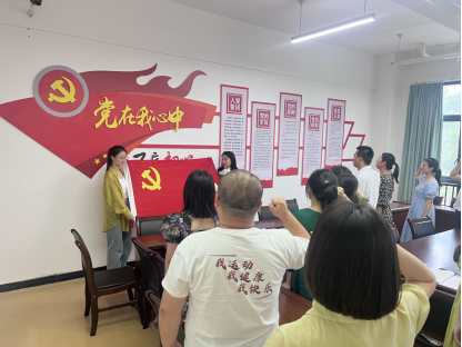 合影结束后,支部书记谢文贤带领全体党员重温入党誓词,不忘初心,牢记使命,全心全意为国育才、为党育人,就是每一位党员教师的初心使命。