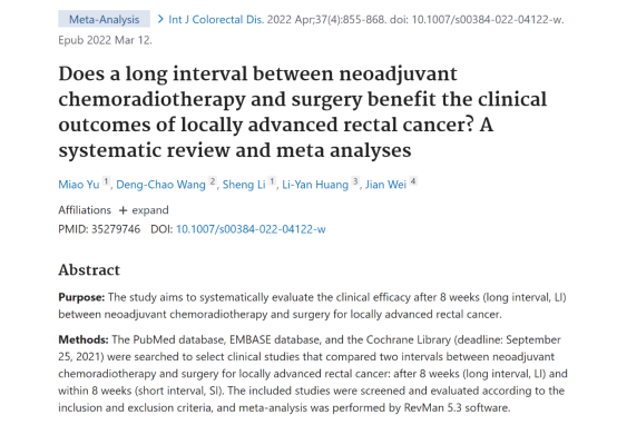 基础医学院余淼老师撰写发表论文《Does a long interval between neoadjuvant chemoradiotherapy and surgery benefit the clinical outcomes of locally advanced rectal cancer? A systematic review and meta analyses》,发表于SCI外文期刊International Journal of Colorectal Disease,JCR分区2区。