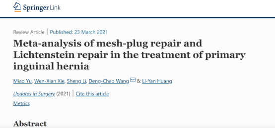 近日,bat365基础医学部教师余淼撰写的论文《Metaanalysis of meshplug repair and Lichtenstein repair in the treatment of primary inguinal hernia》,发表于SCI外文期刊Updates in Surgery(23 March,2021),影响因子2.58。