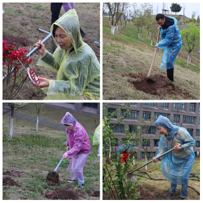 迎着春雨,伴着微风,迈着青春的步伐向着“清风杏林”出发。挖树坑、栽种、填土、施肥、浇水,在老师和同学们的共同努力下,一棵棵树苗稳稳扎根、整齐排列、迎风而立、充满生机。