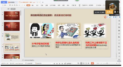 为适应疫情形势,学院纪检监察处还创新警示和纪律教育的形式,在4月15日晚上,利用腾讯会议平台,为学院康复系全体教职工开展了一场纪律宣讲。康复系马天凤老师在听完宣讲后表示,案例中一些教师的违纪违法行为,对于部分初入职的年轻教师来说不足为怪,甚至不认为做法有欠妥之处,在参加了这次学习后我们才发现,自己的思想是有偏差的,建议多开展此类培训,弥补教师法纪知识的盲区。